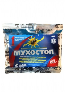 СКЛАД 1 г препарату містить діючі речовини: ацетаміприд - 100 мг, 0,05% трикозен (феромон, який приваблює мух), денатоній бензоат 0,002% (гіркий компонент). ДОЗУВАННЯ Препарат слід застосовувати у вигляді розчину для нанесення на поверхні або обприскування поверхонь. Нанесення на поверхні: Приготування робочого розчину: в окремій ємності розчинити 6 г Мухостоп в 4,8 мл холодної води. Ретельно розмішати до отримання однорідного розчину. Cпocо6 проведення обробки: отриманого розчину достатньо для обробки приміщень загальною площею 2,4м2. Обприскування поверхонь: Приготування робочого розчину: в ємності апарату для обприскування розчинити 6 г препарату Мухостоп в 48 мл холодної води, ретельно розмішати. Cпocо6 проведення обробки: отриманого розчину достатньо для обробки приміщень площею 1,2м2. Безпосередньому обприскування слід піддати близько 30% поверхні. Тривалість дії: захист до 3 місяців. ЗБЕРІГАННЯ У місцях, не доступних для дітей і домашніх тварин, включаючи птахів, захищаючи від впливу вологи і прямих сонячних променів. Окремо від харчових продуктів при температурі не нижче -10 °С і не вище 40 °С. Термін придатності - 3 роки.