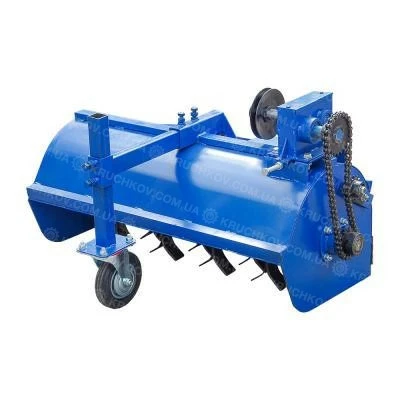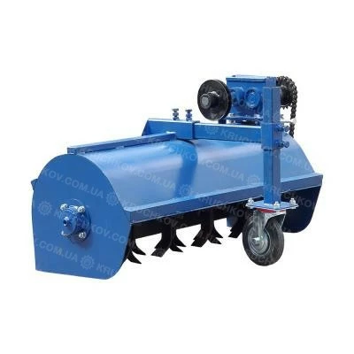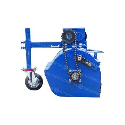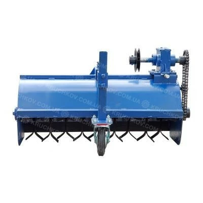 Крутящий момент от маховика двигателя мотоблока или мототрактора с помощью ременной передачи передается на шкив редуктора, который приводит в действие вал. На противоположной стороне вала редуктора установлена звездочка. Вращение передается на вал мульчера через цепную передачу.