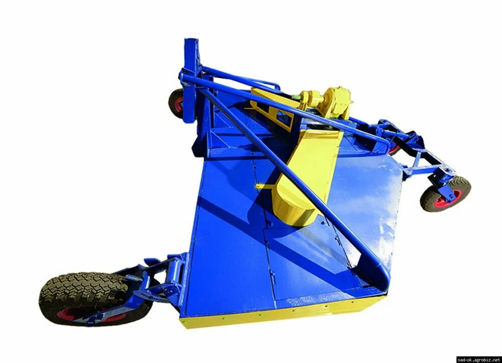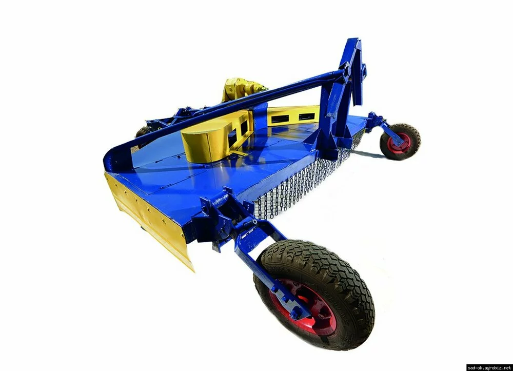 Измельчение достигается путем срезания и перемалывания остатков ножами, изготовленными из углеродистой стали, прошедшей термообработку. Ножевая система состоит из трех роторов, на которых находится по 4 ножа. Один ротор (средний) приводится в действие непосредственно от вала редуктора, два других (боковые) через ременную передачу (по 3 ремня на каждый ротор). Данное техническое решение обеспечивает качественное измельчение растительных остатков с равномерным распределением по поверхности почвы. В приводе редуктора установлена муфта сцепления, которая устраняет динамические нагрузки на трансмиссию при остановке ВОМ и на весь механизм в целом при попадании ножа на препятствие. Усиленный каркас устраняет риск деформации конструкции.