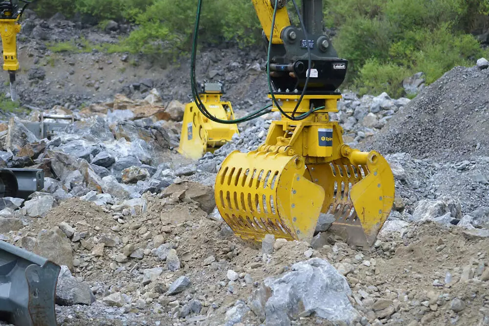 Мультигрейфер Epiroc MG400 на екскаватор. Вага машини-носія — 4-8 т. Мультигрейфери Epiroc відмінно впораються не тільки з перевантаженням і сортуванням матеріалів, а й з розбиранням кладки або конструкцій з деревини. Мультигрейфери серії MG здатні з максимальною точністю обробити будь-який матеріал. Вони відрізняються надійним захватом та високим зусилля протягом усього циклу роботи.