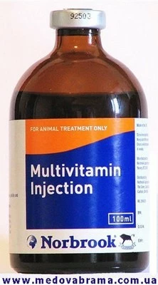Склад і форма випуску:Являє собою розчин для ін'єкцій, до складу якого входять жиро - і водорозчинні вітаміни, розчинник – вода для ін'єкцій і емульгатор. 1 мл лікарського засобу містить: Ретинолу пальмітат (Вітамін а) — 15000 МО, Холекальциферол (Вітамін Д3) — 1000 МО, Токоферол (Вітамін E) — 20 мг, Тіамін (Вітамін B1) — 10 мг, Рибофлавін (Вітамін B2) — 5 мг, Піридоксин (Вітамін B6) — 3 мг, Ціанокобаламін (Вітамін B12) — 50 мг, Нікотинамід — 35 мг, Пантотенол — 25 мг, Лікарський засіб являє собою розчин для ін'єкцій золотисто-коричневого кольору. Випускають розфасованим по 100 мл у скляні флакони темного кольору.