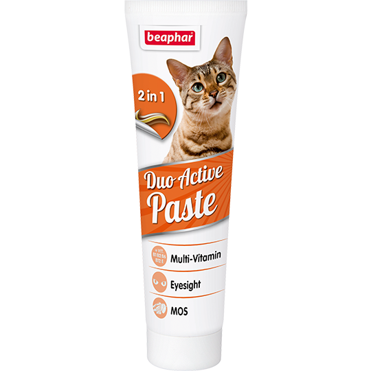 Мультивітамінна паста Beaphar Duo Active Paste – це харчова добавка для котів у вигляді двокольорової пасти. Насичує організм необхідними вітамінами та покращує кишкову флору. Особливо рекомендується після прогону гельмінтів, хвороб або ухвалення антибіотиків. Полівітамінна (жовта) паста містить усі вітаміни та мінерали, які потрібні кішці для підтримки її здоров'я та доглянутого вигляду. Омега-6 забезпечує здорову шкіру та вовну, сприяє виробництву крові, підвищує опірність організму хворобам. Кондиціонує (коричнева) паста містить додаткові мінерали та біо-мосс (маннан олігосахариди). Біомос абсорбує токсичні речовини з організму і активно стимулює формування здорової кишкової флори у кішки.