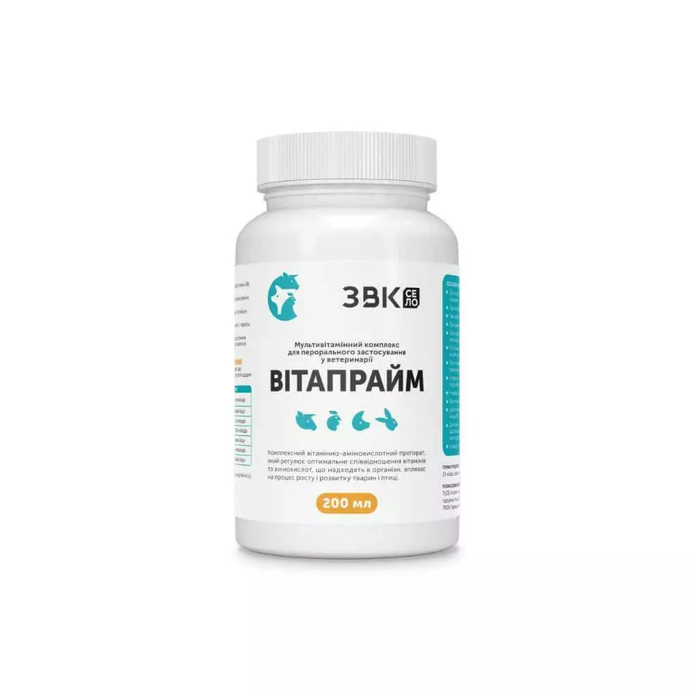 Вітапрайм – це збалансований мультивітамінний комплекс із вітамінами та амінокислотами для тварин і птиці. Підтримує імунітет, сприяє швидкому росту, підвищує продуктивність і стійкість до стресів. Допомагає після хвороб, вакцинацій та лікування антибіотиками. Покращує апетит, травлення, несучість і якість потомства. Вітапрайм підходить для курей, свиней, ВРХ, коней, кіз і кролів. Простий у застосуванні — додається у питну воду. Ідеальний для профілактики авітамінозу та зміцнення здоров’я тварин.