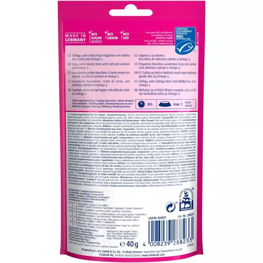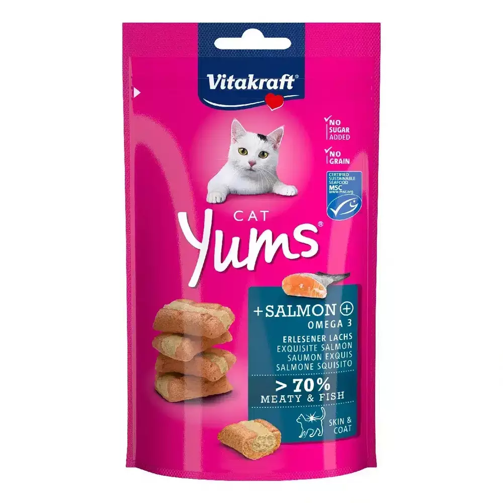 Екстрам’ясні ласощі Vitakraft Cat Yums®+ Lachs & Omega 3 з ніжним лососем та Омега-3 мають унікальний процес приготування – з відбірних інгредієнтів, без цукру та без додавання зерна чи сої. Лосось і Омега-3, які містяться у ласощах покращують стан шкіри та шерсті. Делікатно запечені в духовці Cat Yums® виходять не тільки неймовірно смачними, але й ароматними та соковитими.