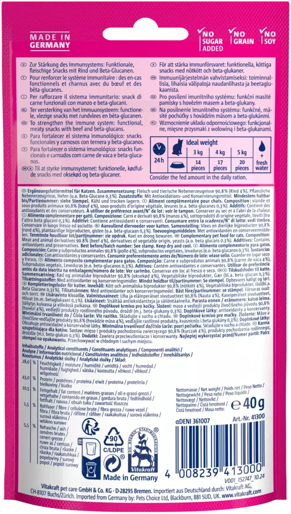 Яловичий варіант містить додані бета-глюкани для зміцнення імунної системи вашого кота, забезпечуючи смачну ласощу із заспокійливими властивостями. Для моментів перекусу, які приносять користь.