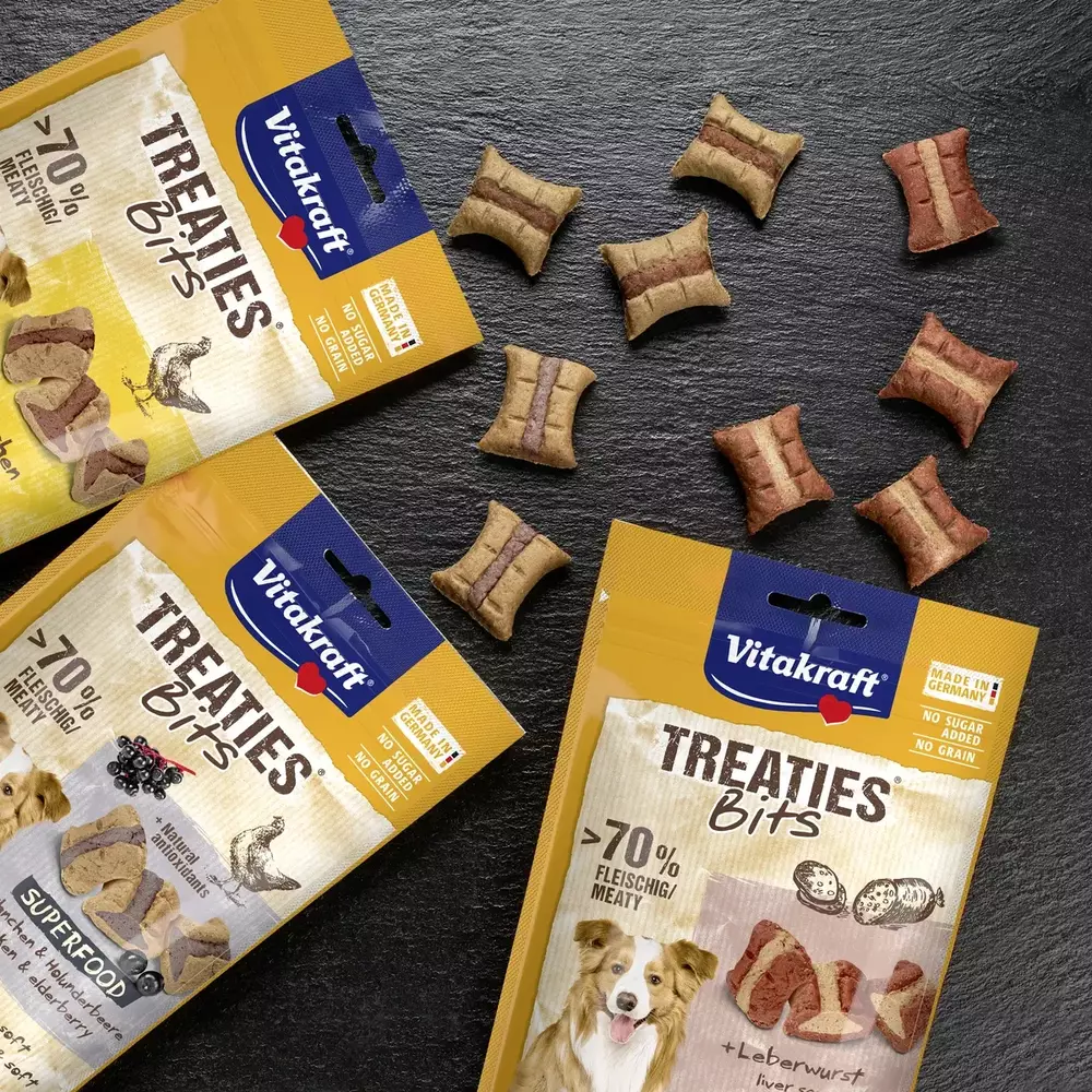Vitakraft® TREATIES® делікатно запікаються у печі, тому залишаються соковитими всередині. Вміст м’яса понад 70%. Особливість цих ласощів — кожен шматочок має апетитну начинку. Ідеально, щоб потішити вашого чотирилапого друга!