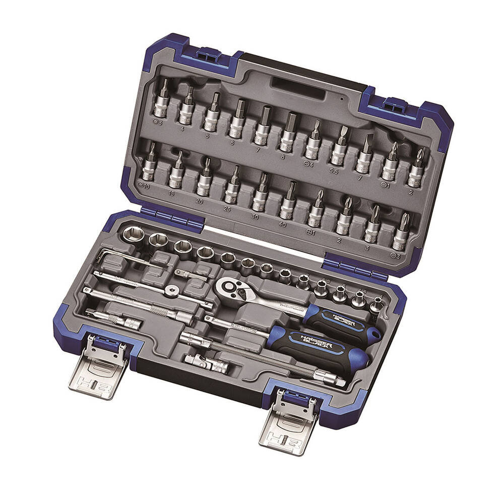Набір інструментів професійний 1/4" 46 од. Haisser BLACK 70256  Характеристики набору: Основні елементи виготовлені з високоякісної CR-V сталі з підвищеним складом ванадію, для запобігання корозії та збільшення зносостійкості; Матеріал головок 50BV40, з подвійним гальванічним покриттям; Тріскачка 90 зубів з ергономічною ручкою, матеріал робочої частини CR-MO; Матеріал біт S2, з спеціальним антикорозійним покриттям; Протиударний посилений кейс, з захисними елементами  Антикорозійна обробка одиниць набору Склад набору: 13 шт Головки торцеві 1/4": 4, 4.5, 5, 5.5, 6, 7, 8, 9, 10, 11, 12, 13, 14 мм 1 шт Тріскачка з реверсом 1/4" 90 зубців 2 шт Подовжувачі 1/4": 50, 100 мм 1 шт Подовжувач гнучкий 1/4" 150 мм 1 шт Ручка викруткова 1/4" 150 мм 1 шт Шарнір карданний 1/4" 1 шт Вороток 1/4" 110 мм 1 шт Адаптер для біт 1/4" 4 шт Ключі шестигранні: 1.27, 1.5, 2, 2.5 мм 21 шт Біти торцеві 1/4": PH 1, 2, 3; PZ 1, 2, 3; T 10, 15, 20, 25, 30, 40; H 3, 4, 5, 6, 7, 8; SL 4, 5.5, 7 1 шт Кейс ударостійкий