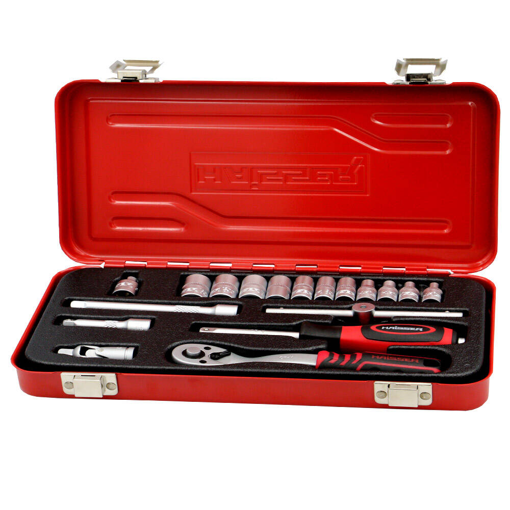 Набір інструментів професійний 18 од. Haisser 70193 Професійний набір інструментів Haisser – універсальний набір для побутового та професійного застосування. Призначена для виконання широкого спектру ремонтних та складальних робіт. До складу цього набору входять 18 предметів. Укомплектований набір у металевий кейс. Комплектація набору: Торцеві головки 1/4": 4, 4.5, 5, 6, 7, 8, 9, 10, 11, 12, 13мм - 11шт.; Карданний шарнір 1/4"; Подовжувачі 1/4": 50, 100мм - 2шт.; Тріскачка 1/4" 72Т; Адаптер 3/8"(F)×1/4"(M); Вороток Т-подібний 1/4" 110мм; Вороток викрутковий 1/4" 150мм;
