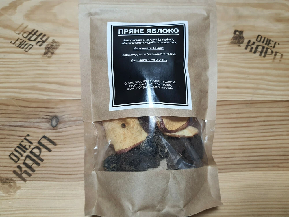 Склад: яблуко сушене, ізюм, чорнослив, гвоздика, мускатний горіх, декстроза, тріска дуба (середня обжарка)