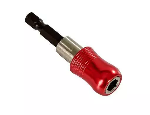 Тримач для біт виготовлений з нержавійної сталі, хвостовик із Cr-V сталі. У тримачі встановлено потужний магніт, який надійно фіксує навіть довгі біти та полегшує вкручування гвинтів. Крім магніту реалізований фіксатор, який унеможливлює випадіння біт при роботі. Насадки легко встановлюються в тримач одним натисканням, а відтягнувши назад втулку, їх легко звільнити. Такий пристрій дозволяє швидко змінювати біти та надійно їх утримувати.