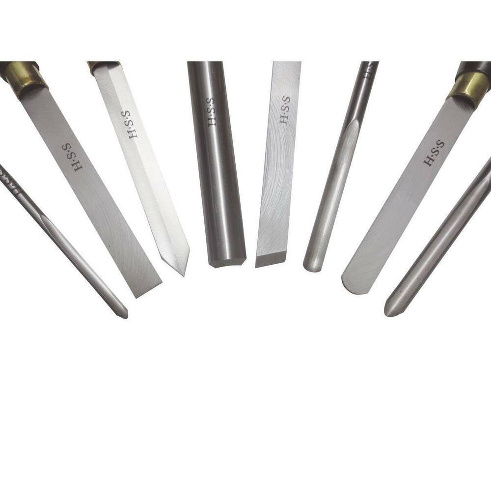 Черновая трубка 8 х 160 мм; Плоское зубило 19 х 6,3 х 160 мм; Прорезной инструмент 19 х 4,8 х 160 мм; Черновая сталь 22,2 х 160 мм; Угловое долото 19 х 6,3 х 160 мм; Трубка чаши 12,7 х 230 мм; Плоское зубило около 19 х 6,3 х 160 мм; Черновая трубка 12,7 х 200 мм; Длина ручки = 240мм; Материал ручки - дерево; Материал лезвия: твердость HSS 4341 (57-63 HRC).