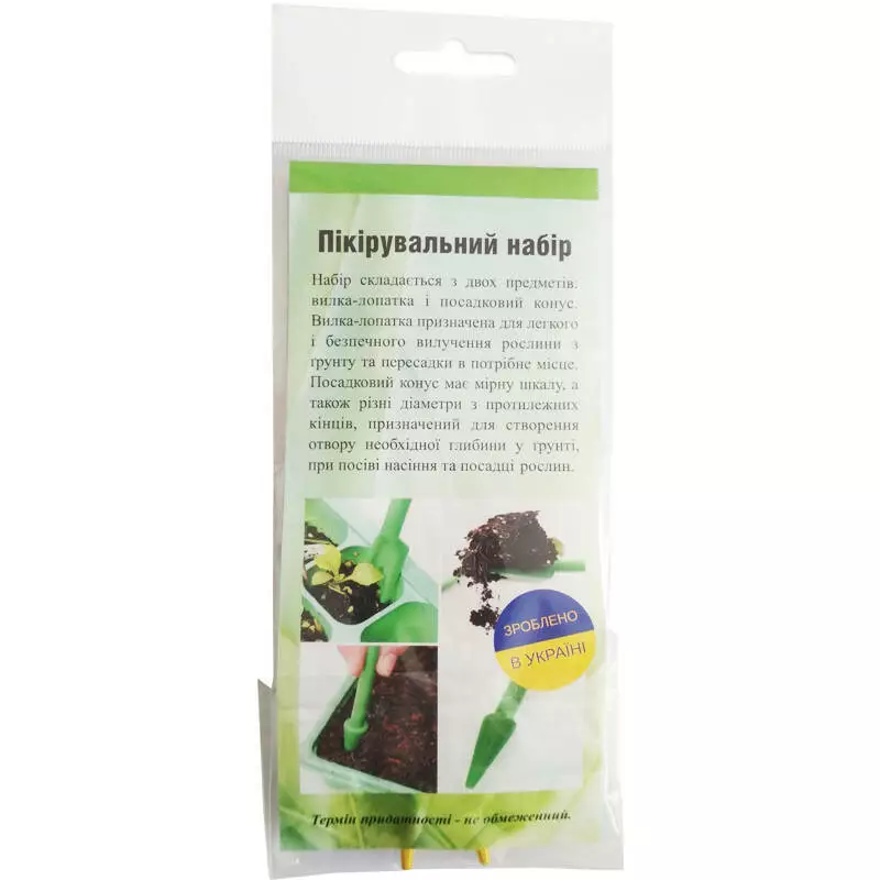 Набір для пікірування рослин – стане в нагоді при пікіровці розсади та догляду за кімнатними рослинами. Він складається з двох предметів: вилка-лопатка і посадковий конус.