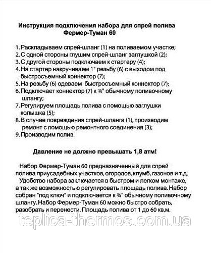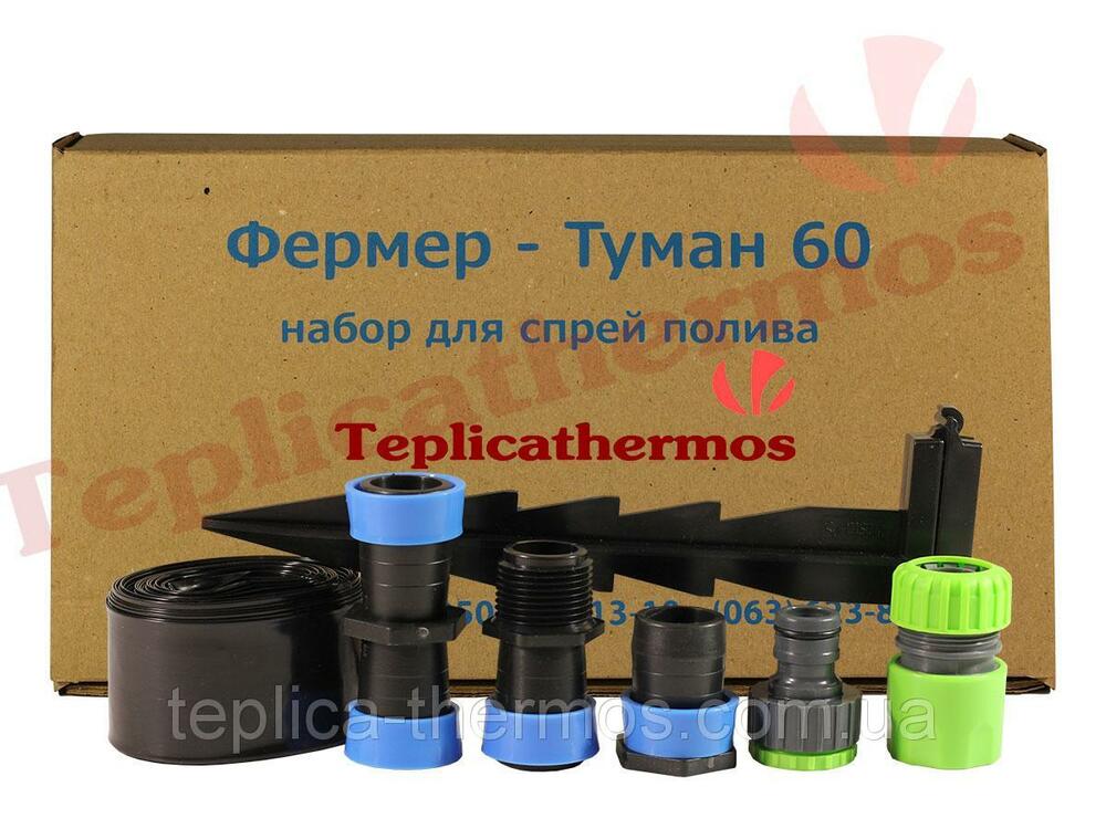 Набір Фермер-Туман 60 призначений для спрей поливання присадибних ділянок, городів, клумб, газонів тощо. Зручність набору полягає в швидкому та легкому монтажі, а також можливістю регулювати площу поливання. Набір зібраний "під ключ" і приєднується до 3/4" звичайного поливального шланга. Набір Фермер-Туман 60 можна швидко зібрати, розібрати та перенести. Площа поливання від 1 до 60 кв.м.