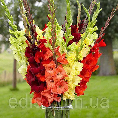 Цей набір червоних, бордових, помаранчевих і жовто-салатових гладіолусів нагадає Вам про прекрасних південних заходи в кінці літа. Насолоджуйтеся стильними клумбами і букетами з нашими ексклюзивний наборами.