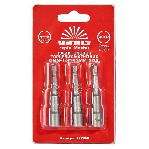 Набір головок торцевих магнітних 8 мм 1/4″×65 мм 3 шт. Vitals застосовується для відкручування та закручування покрівельних шурупів під час роботи з профнастилом. Насадка має вбудований потужний магніт, який надійно фіксує шуруп у головці та не дозволяє йому випадати під час роботи. Виготовлені з високоміцної сталі 40CR, яка відрізняється довговічністю та не схильна до крихкого руйнування. Довжина насадки складає 65 мм.