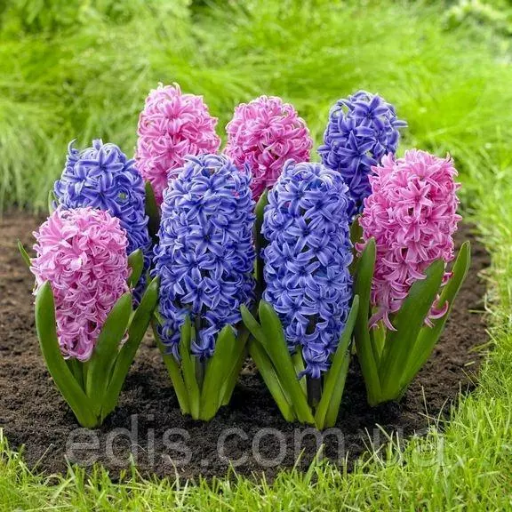 Цибулини квітів: комплект цибулин гіацинтів "Блакитна мрія". Яскрава та гармонійна композиція з рожевого та синього гіацинтів! Рожевий – колір творення, мрійливості та доброти. Синій – це колір океану і неба, сили та безмежності. Нехай ця гармонія синього з рожевим нагадує нам, що мріяти не означає бути дівчинкою. Мрії мудрих, дорослих людей глибші, але все також солодкі! Квіти Гіацинтів: легко виростити; це багаторічні квіти; великі, яскраві, ароматні квіти; цвітуть одними з перших квітів у саду; не хворіють, не пошкоджуються шкідниками; можна садити в горщики та контейнери; на підвіконні та балконі можуть цвісти з січня! Гіацинти мають велику квітку і сильний аромат. З весняних цибулинних – це найбільші квіти. Вони абсолютно самодостатні, тому горщик навіть із трьома гіацинтами виглядає багато, а десяток гіацинтів на клумбі не залишать байдужим нікого. Гіацинти добре вдаються навіть у зовсім недосвідчених руках, тому що все, що їм потрібно для цвітіння вже запасено в цибулинці і весь догляд можна звести просто до періодичних поливу. У цьому комплекті гіацинти рожевого та синього кольорів. Ви можете купити у нас цибулини двох сортів гіацинтів у таких тонах і висадити їх рядами вздовж бордюру, по колу або створюючи вишукані візерунки. Ціна вказана за упаковку з двох цибулин калібру 14/15 та 15/16, які чудово підходять для вирощування на клумбі у саду. Для вирощування в горщиках (в обмеженому ґрунті) краще підходять цибулини більшого розміру. Великі (горщикові) цибулини гіацинтів для такої клумби можна замовити нашому оператору за телефоном або вибрати самостійно в нашому каталозі сорти гіацинтів із позначкою калібру 16/18 та 18/19.