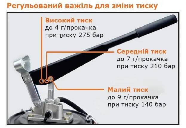 • має регулювання об'єму мастила, що видається, і тиску (див. фото)