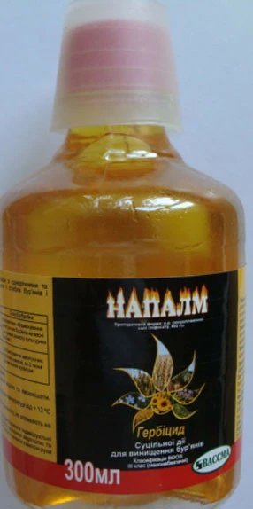Напалм - це системний гербіцид загальної дії для знищення одно- та багаторічних бур'янів при вирощуванні овочевих культур. Швидко переноситься судинною системою по всіх органах, в тому числі і до кореневої системи. Рослини гинуть через 5 - 10 днів, в залежності від погодних умов та виду бур'янів. Перші ознаки гербіцидної ефекту з'являються не раніше, ніж через 3 - 4 дні, спочатку це пожовтіння, потім починається побуріння і в'янення листя.