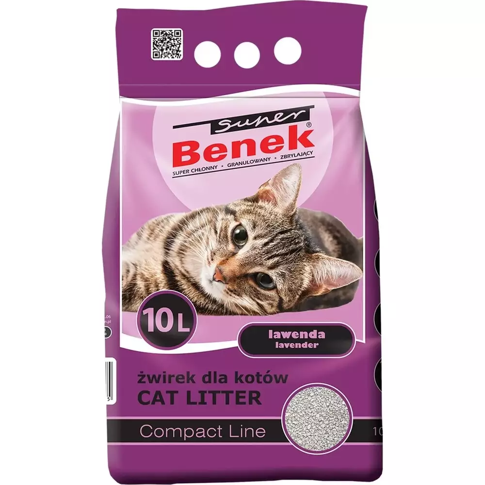 Super Benek Compact Lavander - прекрасний дрібнозернистий наповнювач, що комкується. Складається з натурального білого мінералу бентоніту, який має унікальні поглинаючі властивості. Має приємний заспокійливий аромат лаванди і рекомендується для молодих, дуже активних тварин, які довгий час проводять на свіжому повітрі. Ароматична композиція нанесена за технологією Long-Lasting Fragrance Technology, завдяки чому наповнювач довго зберігає освіжаючий аромат цитрусових.