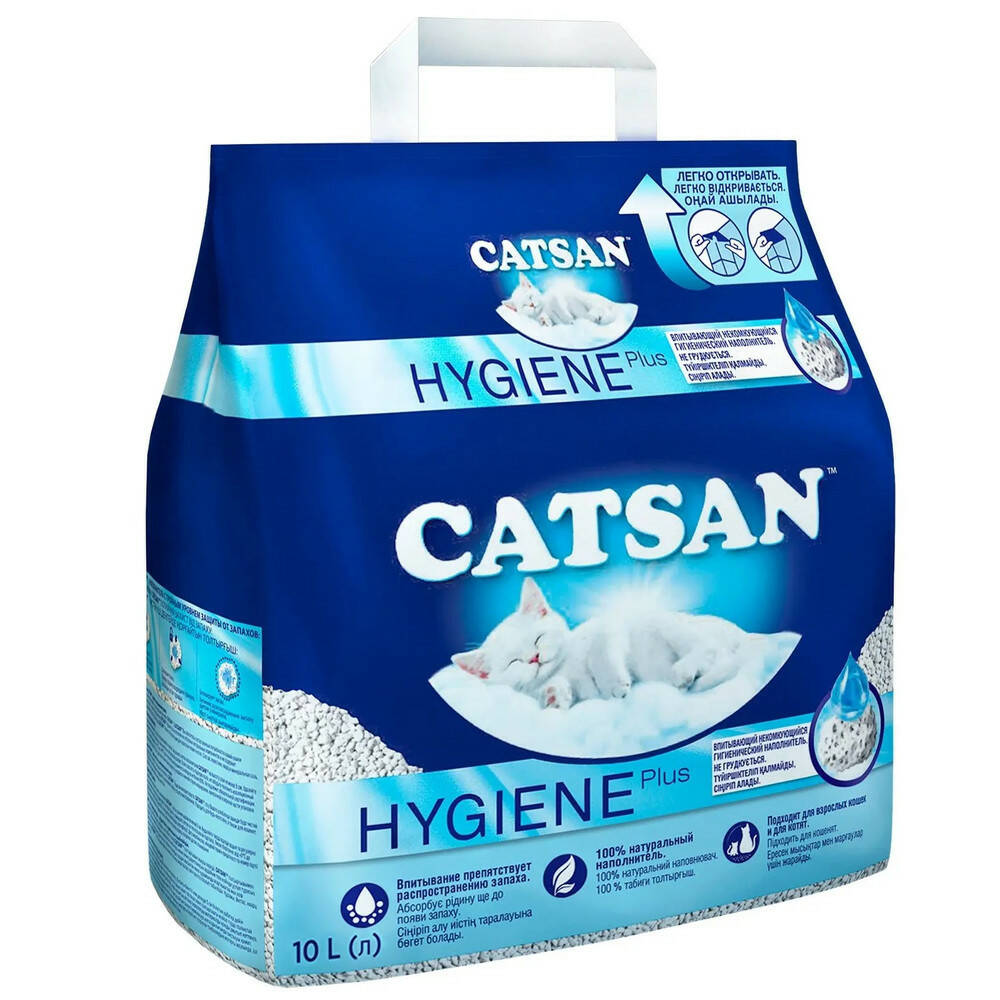 Catsan Hygiene plus – гігієнічний наповнювач для котів, що вбирає, не порошить і не має запаху. Складається з унікальних ультрапоглинаючих пористих гранул, які складаються з натурального кварцового піску та очищеної крейди та мінералів, які миттєво поглинають рідину та запах, як губка. Унікальний процес виробництва робить Сatsan виключно ефективним абсорбентом, він набагато економніший за звичайні наповнювачі і його можна використовувати набагато довше. Сatsan — експерт у галузі котячої гігієни вже понад 30 років.