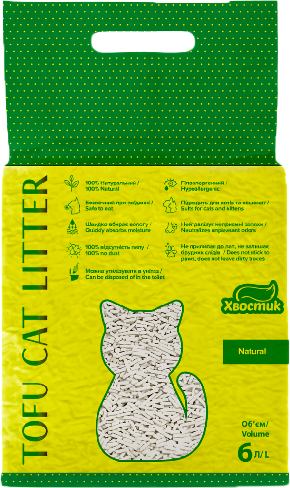 Наповнювач Tofu – це природне рішення для котячого туалету. Цей наповнювач інноваційний, екологічно чистий та безпечний. Основний інгредієнт волокна сої. Головною особливістю наповнювача Тофу Хвостик є його натуральність та гарне поглинання. Розмір гранул підходить як для дорослих кішок, так і для кошенят, їжаків, єнотів та інших тварин.