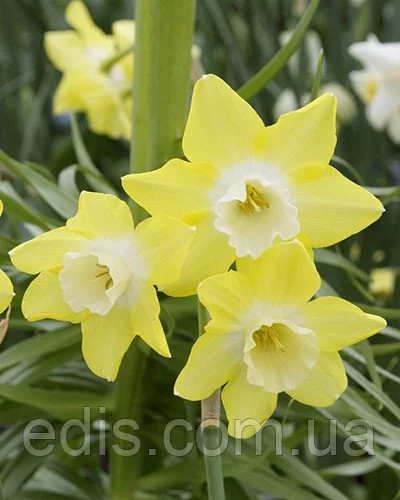 опис квітки: лимонно-жовті пелюстки з кремово-білою чашкою, до 7 см у діаметрі;