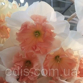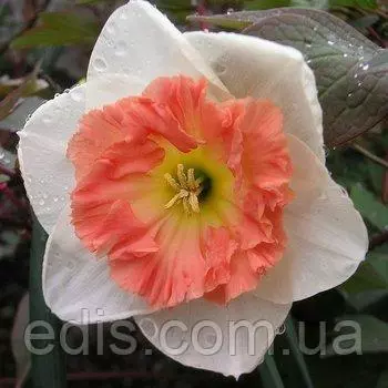 квіти пофарбовані в три кольори: білі пелюстки оцвітини, рожево-помаранчева корона з жовтим центром;