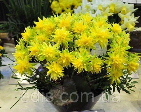 Опис: нарцис Ріп ван Винкль (Rip van Winkle) Дуже приваблива новинка серед махрових нарцисів для посадок переднього плану і, особливо, для горщика. Нарцис Rip van Winkle має досить низький зріст - всього 20 см. і відносно великий лимонно-жовтий квітка незвичайної форми. "Кактусова" форма квітки досить рідкісна серед нарцисів, тому Ріп ван Винкль користується дуже великою популярністю. На кінчиках гострих пелюсток утворюються цікаві білі потовщення, які нагадують крапельки роси і привертають додаткову увагу. Названий сорт в честь головного героя однойменної новели Вашингтона, який впав на 20 років в летаргічний сон, а коли прокинувся, всі його колишні проблеми вже самі собою давно закінчилися.