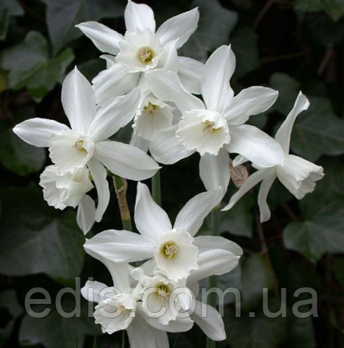 Нарцис Мініатюрний Thalia Нарциси Мініатюрні– квітки поодинокі, коронка квітки не перевищує 1/3 довжини часток оцвітини.Листя прикореневі, лінійні, зібрані в розетку. Вони плоскі, щільні, шкірясті, шириною від 0,5 до 3 див. Квітконіс безлисте, від 8 до 35 см заввишки. Забарвлення коронки може відрізнятися в залежності від сорту, а пелюстки зазвичай забарвлені в жовтий або білий кольори. Цибулини нарцисів у мають округло-грушовидну форму і можуть бути одне-, двох - або більш верховими. Цвітуть вони у квітні-травні, в період цвітіння становить до 20 днів.