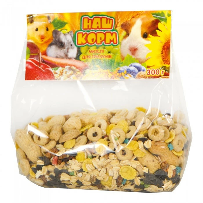 Наш Корм мюслі для гризунів 300 г Оновлена серія доповнень і ласощів до базового корму в новій сучасній упаковці. Мюслі – смачна і поживна добавка до основного раціону. Підходить хом'якам, мишкам, морським свинкам, кролям, дегу. Містить добірні злаки, подрібнені шматочки фруктів і ягід, висушених за особливою технологією з збереженням всіх живильних речовин і мікроелементів. Є додатковим джерелом вітамінів.