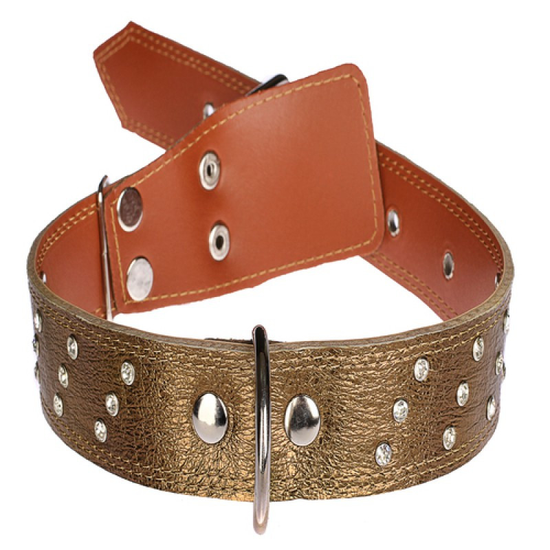 Нашийник 5241 35мм "Перламутр" шкіряний подвійний прикрашений стразами Золотий