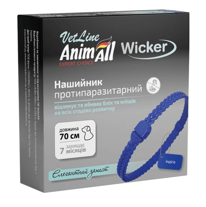 AnimAll Ветлайн Вікер (AnimAll VetLine Wicker) нашийник протипаразитарний для собак та котів Застосування. Профілактика та лікування собак та кішок при ураженні: бліхами (Ctenocephalides felis, St. canis, Pulex irritans), вошами (Linognathus setosus), волосоїдами (Trichodectes canis, Felicola subrostratus) та паразитоформними кліщами (Ixodes spp., Hyal. , Rhipicephalus spp., Boophilus calcaratus). Можна застосовувати як один із засобів при лікуванні алергічного блошиного дерматиту.