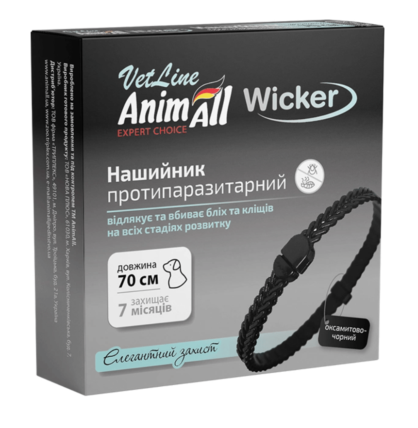 AnimAll Ветлайн Вікер (AnimAll VetLine Wicker) нашийник протипаразитарний для собак та котів Застосування. Профілактика та лікування собак та кішок при ураженні: бліхами (Ctenocephalides felis, St. canis, Pulex irritans), вошами (Linognathus setosus), волосоїдами (Trichodectes canis, Felicola subrostratus) та паразитоформними кліщами (Ixodes spp., Hyal. , Rhipicephalus spp., Boophilus calcaratus). Можна застосовувати як один із засобів при лікуванні алергічного блошиного дерматиту.