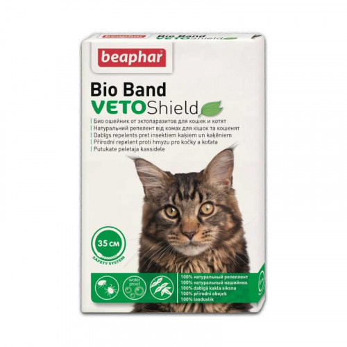 Нашийник «Bio Band» з натуральними оліями для котів та кошенят з 2-місячного віку. Відлякує паразитів, що висмоктують кров (бліх, кліщів, комарів), заспокоює свербіж та подразнення шкіри, усуває неприємний запах тварини. Натуральні рослинні компоненти в складі нашийника, поступово вивільняються та поширюються шкірно-шерстним покривом тварини. Постійне носіння нашийника забезпечує захист від ектопаразитів протягом 4 місяців. Має репелентну дію, а також надає шерсті приємний аромат. Екстракт маргози, що міститься в нашийнику, окрім інсектицидної властивості, сприятливо діє на шкіру – він має антибіотичний, антигрибковий та антивірусний ефект, покращує вигляд шерсті та зменшує свербіж від укусів.