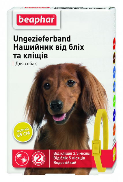 Нашийник інсектоакарицидний Беафар від бліх і кліщів для собак (65 см), жовтий. Знищує паразитів і захищає від повторного зараження бліхами (впродовж 5 міс.) і кліщами (впродовж 2.5 міс.) з моменту одягання. Півлорвінілова водостійка стрічка коричневого кольору з жовтою смужкою на внутрішній стороні, з фіксатором і насічками, які сприяють моментальному розстібанню нашийника та швидкому звільненню тварини.