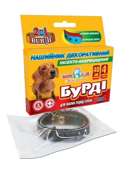 Нашийник декоративний інсекто-акарицидний «Бурді 2 в 1» випускають для собак довжиною 40+5 см, 40-50 см, 60-75 см та для котів довжиною 30+5 см. Нашийники запаковані в пакети з поліетиленової плівки.