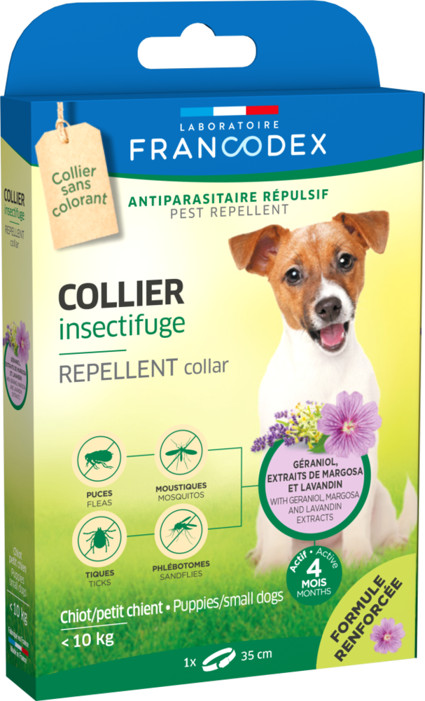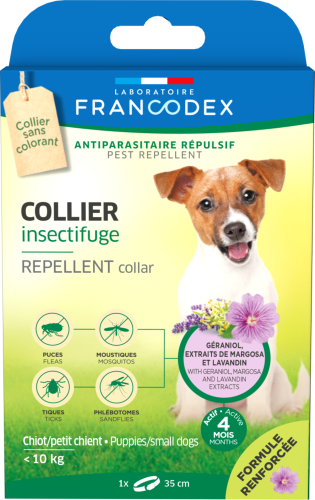 REPELLENT COLLAR FRANCODEX не містить ПВХ і фталатів, виготовлений із гераніолу, маргози та екстракту лавандину, що відлякує комах, захищає від будь-якого зараження паразитами. Ваша собака захищена протягом 4 місяців. Нашийник має систему безпеки, яка дозволяє нашийнику зламатися в разі випадкового вдавлення. Упаковка виготовлена ​​з 100% переробленого картону, щоб допомогти зменшити наш вуглецевий слід.