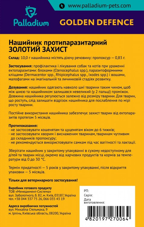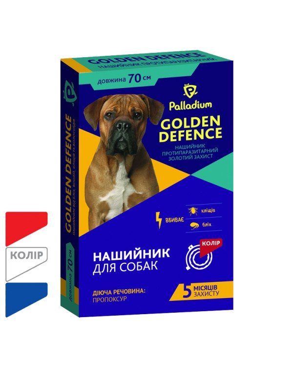 Нашийник для собак Golden Defence - інсектоакарицидний препарат, який призначений для знищення бліх, іксодових кліщів, вошей і волосоїдів , що паразитують на тваринах, а також для захисту від їх нападу.