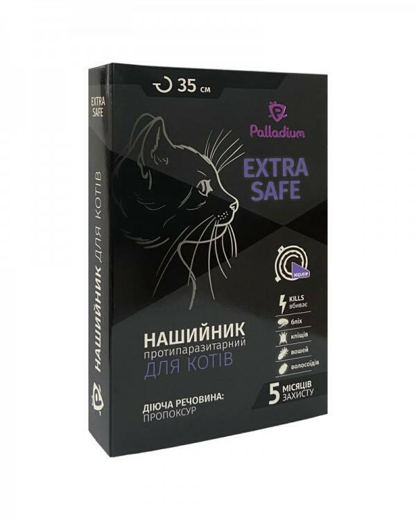 Нашийник від паразитів Palladium Extra Safe - інсектоакарицидний препарат, який призначений для знищення бліх, іксодових кліщів, вошей і волосоїдів, що паразитують на тваринах, а також для захисту від їх нападу.