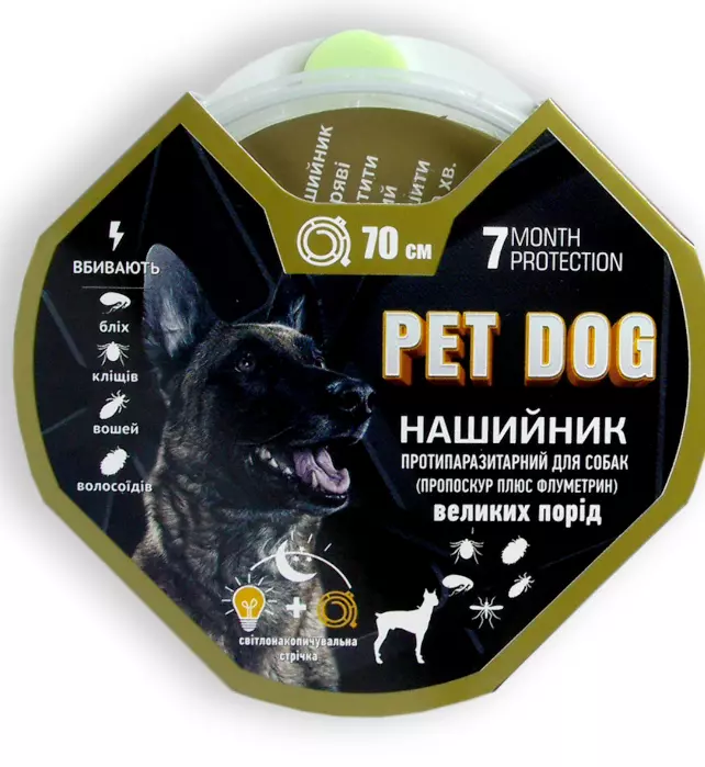 Протипаразитарний нашийник "Pet Dog" для собак великих порід. Являє собою полімерну стрічку завдовжки 70 см зі специфічним запахом складових компонентів, що володіє світлонакопичувальними властивостями (світиться в темряві). Нашийник є сучасним інсектоакарицидним засобом. Він забезпечує ефективне лікування та надійну профілактику зараження собак великих порід зовнішніми паразитами на всіх стадіях розвитку.