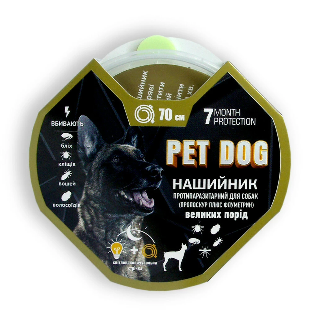 Протипаразитарний нашийник «Pet Dog» для собак великих порід. Являє собою полімерну стрічку довжиною 70 см зі специфічним запахом складових компонентів, що володіє светонакопительными властивостями (світиться в темряві). Нашийник є сучасним инсектоакарицидным засобом. Він забезпечує ефективне лікування і надійну профілактику зараження собак великих порід зовнішніми паразитами на всіх стадіях розвитку.