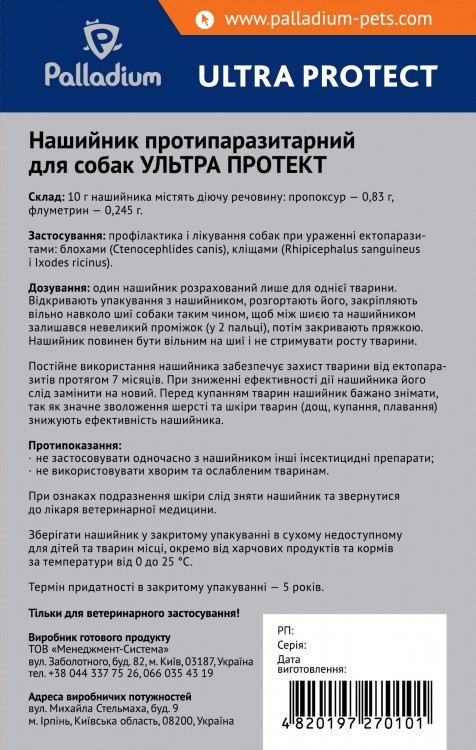 Нашийник для собак Ultra Protect - інсектоакарицидний препарат, який призначений для знищення бліх і іксодових кліщів, що паразитують на собаках, а також для захисту від їх нападу.