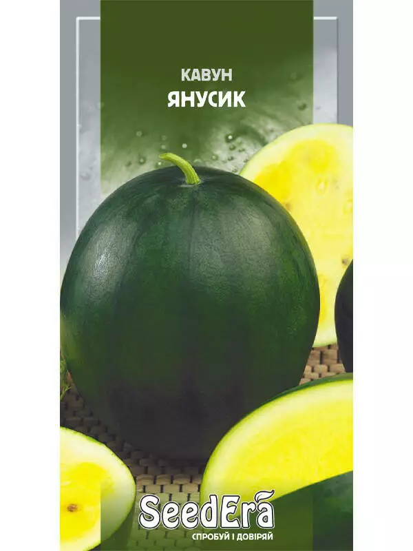Кавун Янусик 1 г - середньоранній сорт (термін дозрівання 75-90 днів з моменту сходів). Плід округло-овальної форми, зеленого кольору, з темними смугами. Вага плоду досягає 3-5 кг. М'якоть кавуна жовтого кольору, соковита, хрустка, дуже солодка і ароматна, з невеликою кількістю насіння. Має хорошу транспортабельність, лежкість. Рослина світло- і теплолюбна. Сорт посухостійкий, стійкий до несприятливих умов погоди. Висівають насіння в теплицях, під плівку і у відкритий грунт в кінці квітня або на початку травня. Віддає перевагу сонячним і безвітряним місцям. Даний сорт дуже подобається дітям завдяки своєму незвичайному забарвленню.