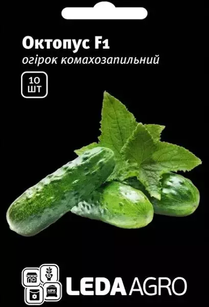 Октопус F1 — раннє стигле, бджолино-зелене забарвлення, генетично без гіркоти, тривалий термін плодоносіння, найкращий гібрид для засолювання