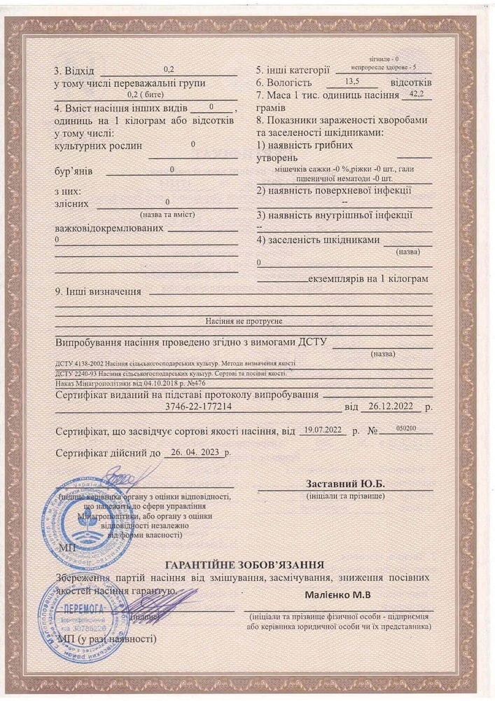 У 2021 році на ланах СТОВ "Перемога" сорт Оксамит миронівський показав рекордний врожай - 64 ц/га.