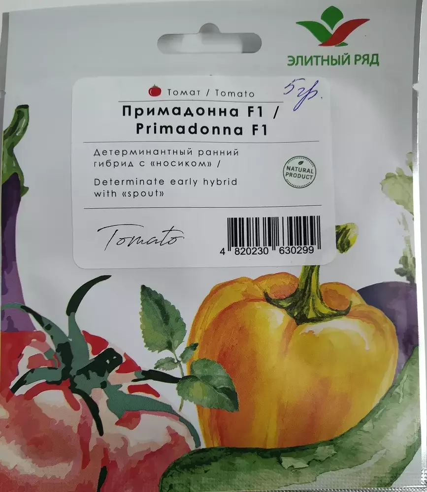 Томат Примадонна - це ранній (90-95 днів від сходів до початку дозрівання) детермінантний томат від компанії Елітний ряд. Висота 120 - 130 см. При формуванні в 1 стебло. Рослина потужна, добреоблиственна. Суцвіття містить 6-7 плодів. Плід без зеленої плями біля плодоніжки, інтенсивно червоного кольору, округлий з "носиком", щільний, транспортабельний, масою 120 - 130 грам, з високими смаковими і товарними якостями. Врожайність 16 - 18 кг / кв.м. Цінність гібрида: Рання, дружна віддача урожаю, високі смакові та товарні якості, відсутність зеленої плями біля плодоніжки. Стійкий до альтернаріозу, витривалий до ВТМ.