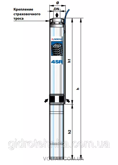 Насосы серии 4SR устанавливаются в скважины, диаметр которых больше 4’’ (100 мм). Насос опускается в обсадную трубу до полного погружения (минимум 50 см под уровнем воды и 1 м от дна скважины), при этом учитывается динамический уровень воды в скважине. В процессе установки насоса рекомендуется закрепить его тросом из нержавеющей стали, который продевается через специальные проушины на корпусе гидравлической части.