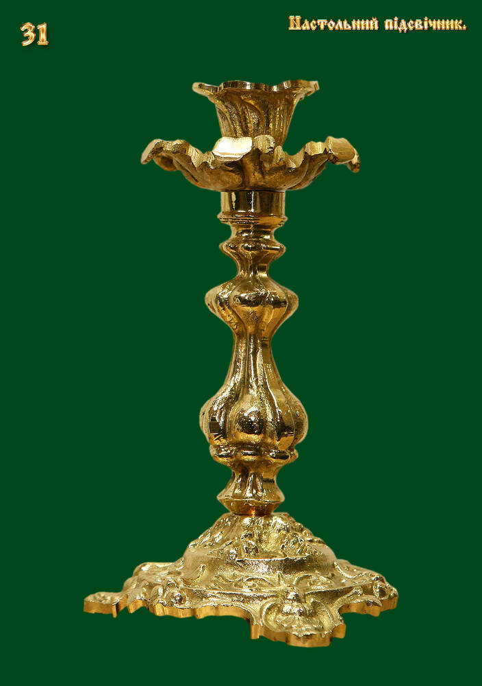 Виготовлений настільний підсвічник з високоякісної латуні, яка додає гарного золотого кольору виробу. Матеріал стійкий до негативних факторів зовнішніх подразників. Міцний та довговічний.