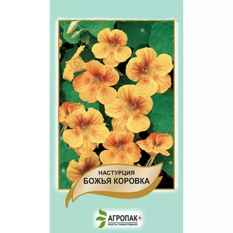 Настурція Божа коровка – компактна однорічна рослина заввишки 30 см з чудовим персиковим забарвленням квіток, на пелюстках яких розташувалися привабливі цятки. Цвіте рясно весь сезон. Необхідний добре дренований грунт і сонячне місце. Чудова рослина для балконних та віконних квіточниць, підвісних кошиків, а також для оформлення бордюрів та робаток.