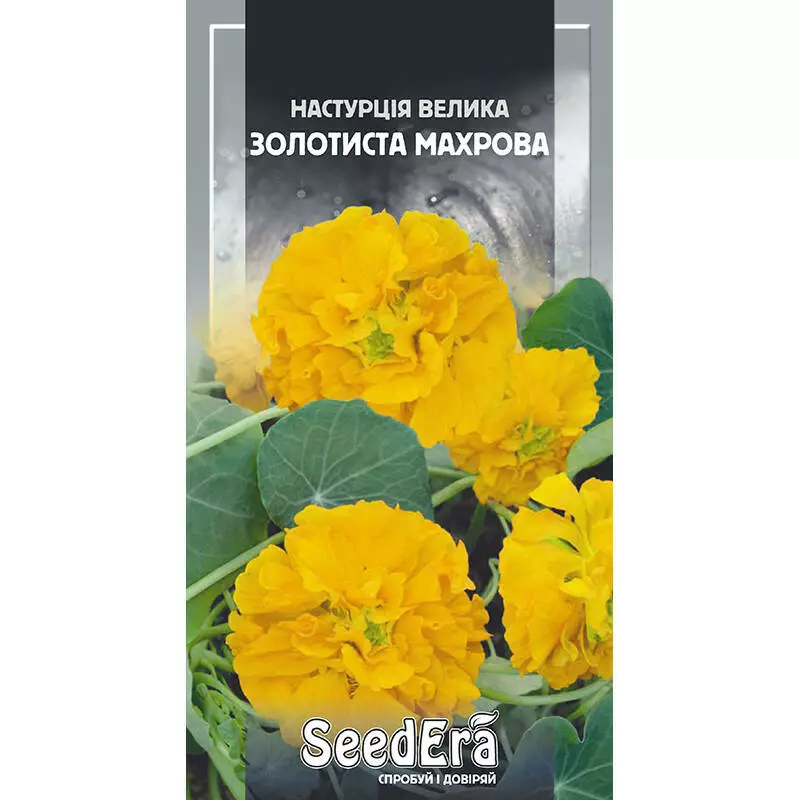 Настурція Золотиста махрова - це культурна багаторічна рослина, а вирощується як однорічна. Стебла сильно розгалужені, стеляться, соковиті, тонкі, до 150 см довжиною. Квіти з тонким приємний ароматом, неправильні, на довгих квітконосах, поодинокі, розташовуються в пазухах листя. Цвітіння відбувається з кінця червня до заморозків. Рослини тепло- та світлолюбиві, віддають перевагу помірно родючим та вологим ґрунтам. Насіння у відкритий Фунт висівають на початку травня. Сходи з’являються через 4-7 днів. Використовують для прикрашення контейнерів, садових ваз, підвісних корзин.
